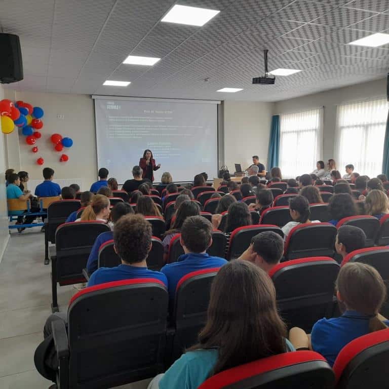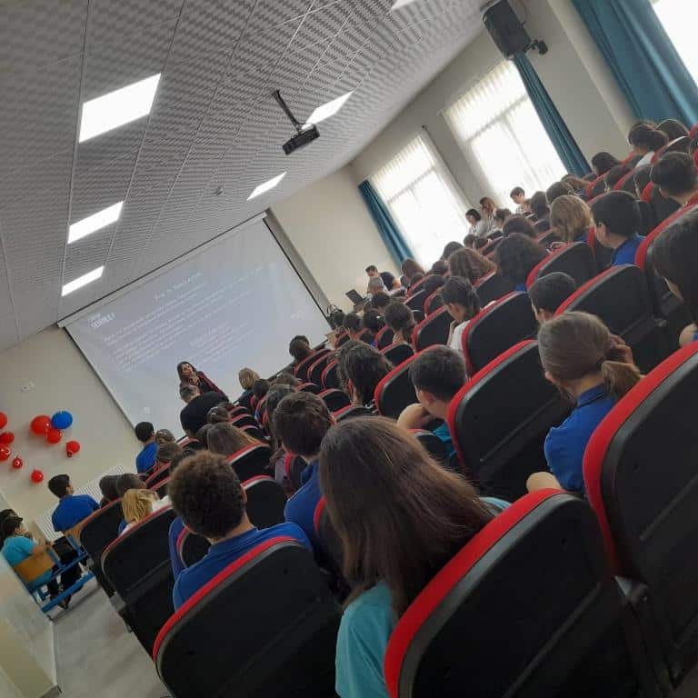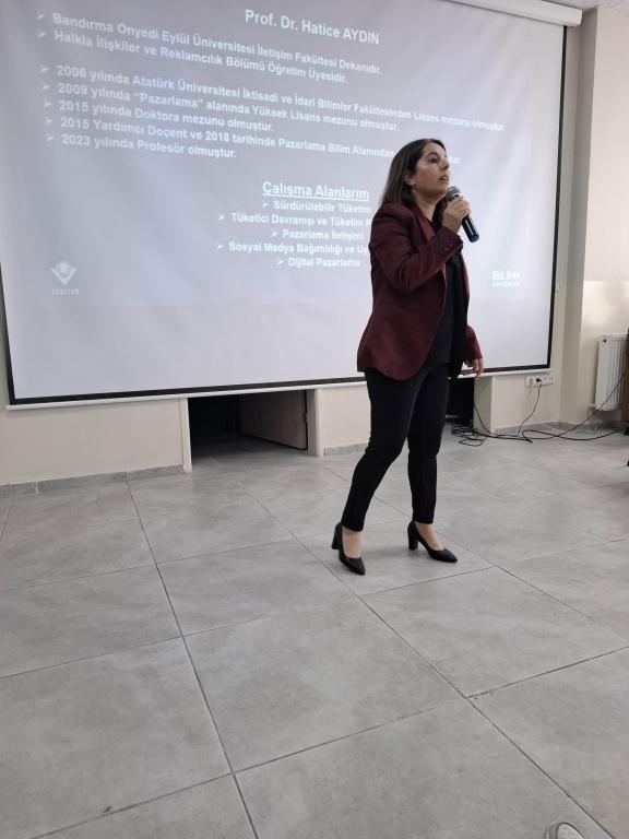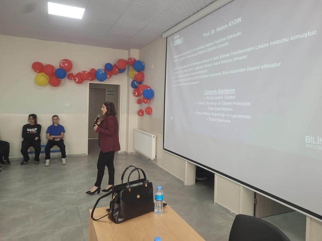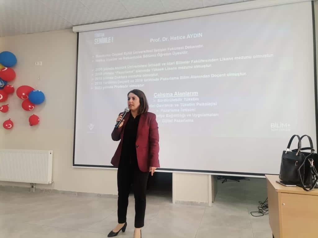 TÜBİTAK Bilim Söyleşileri kapsamında Bandırma 17 Eylül Üniversitesi İletişim Fakültesi Dekanı Hatice AYDIN okulumuzu ziyaret etti. Sürdürülebilir Üretim ve Tüketim konusunda öğrencilerimizi bilgilendirdi. Kendilerine bu faydalı söyleşi için teşekkür ediyoruz.